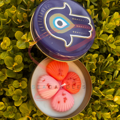 Premium handmade white candle crafted with 100% natural soy wax, infused with a creamy milk fragrance and decorated with real seashells for a serene coastal touch.